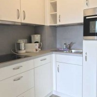 - Die Einbauküche verfügt über ein 4-Platten-Kochfeld, Backofen, Kühlschrank mit Gefrierfach, Wasserkocher, Kaffeemaschine, Toaster und ausreichend Geschirr.
